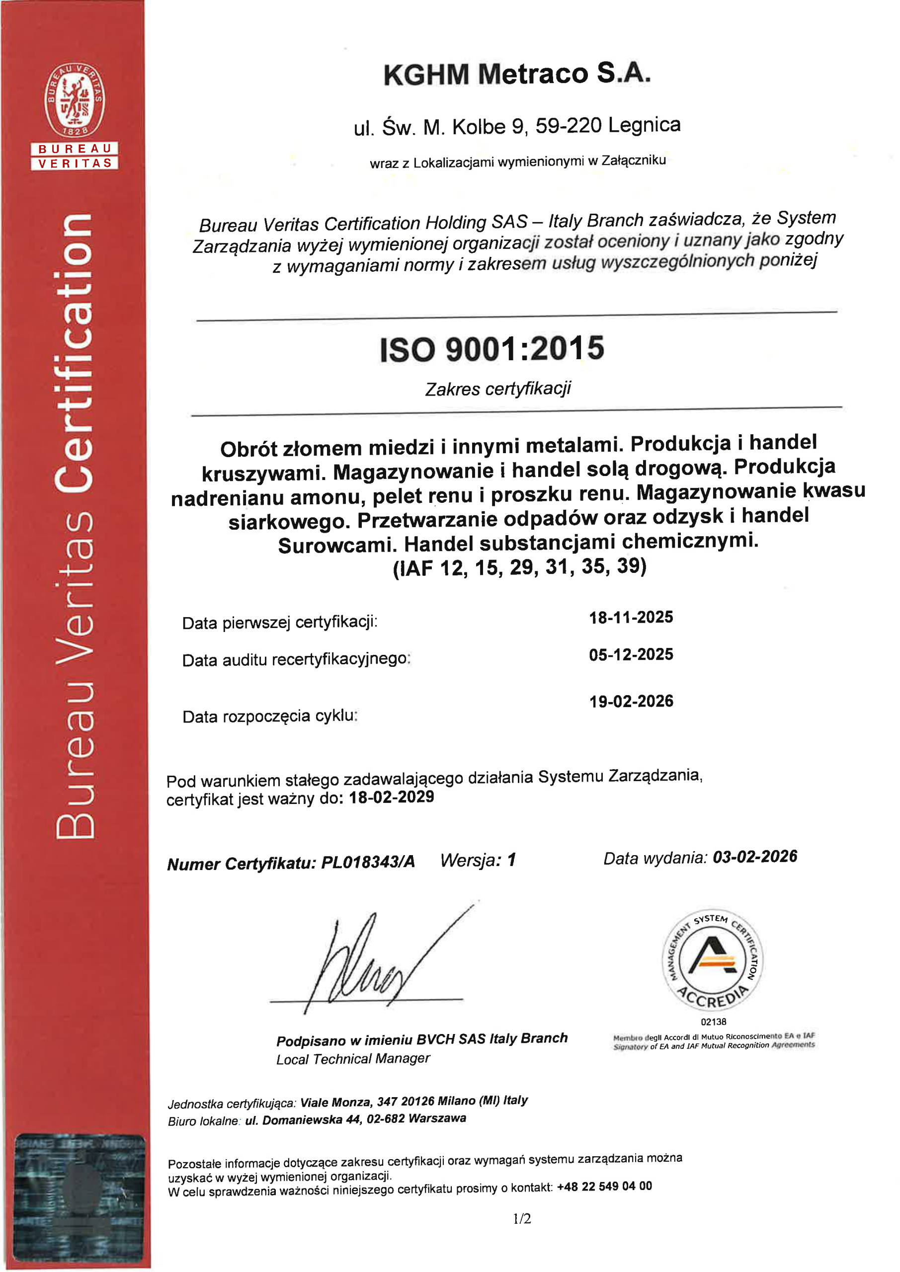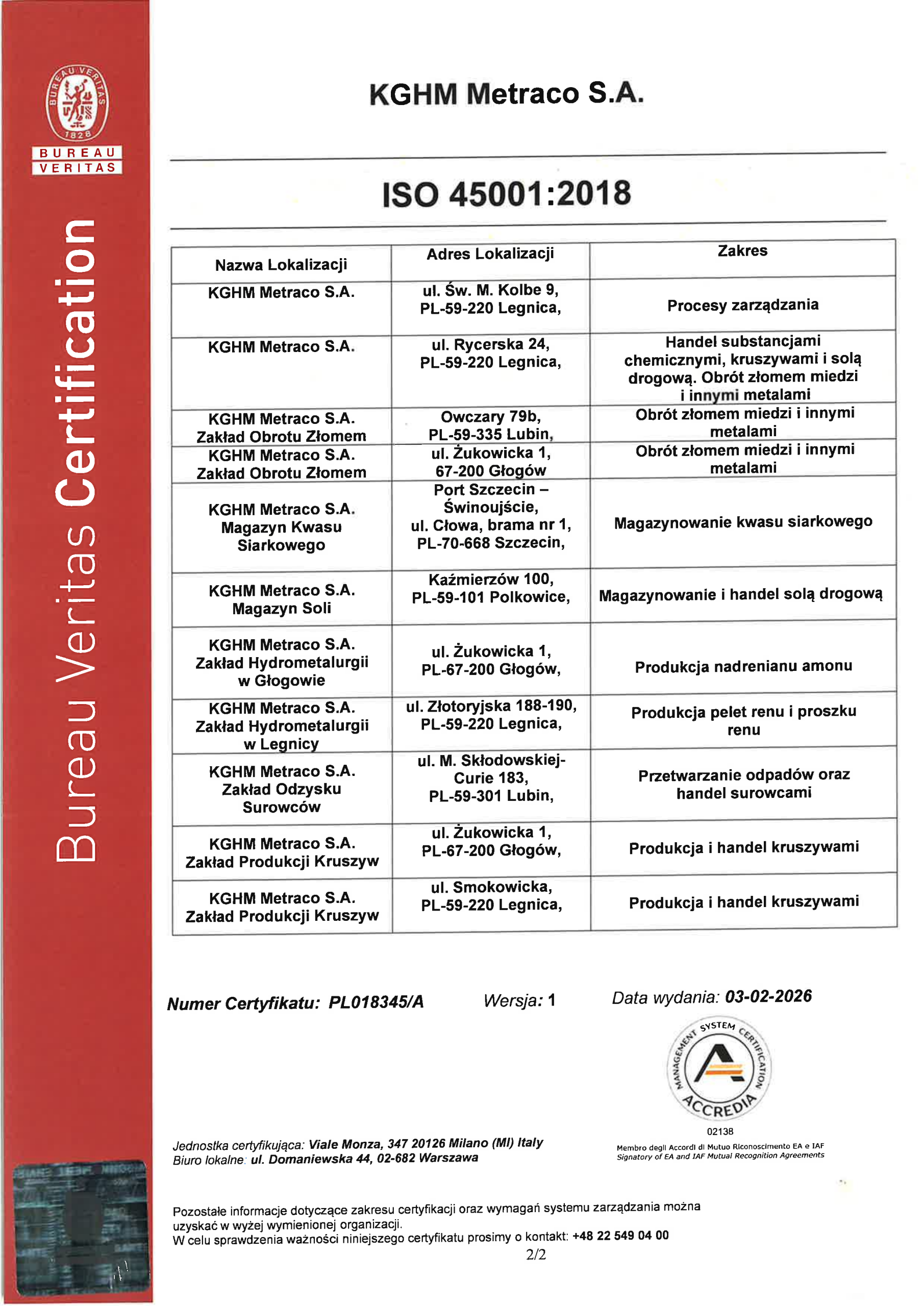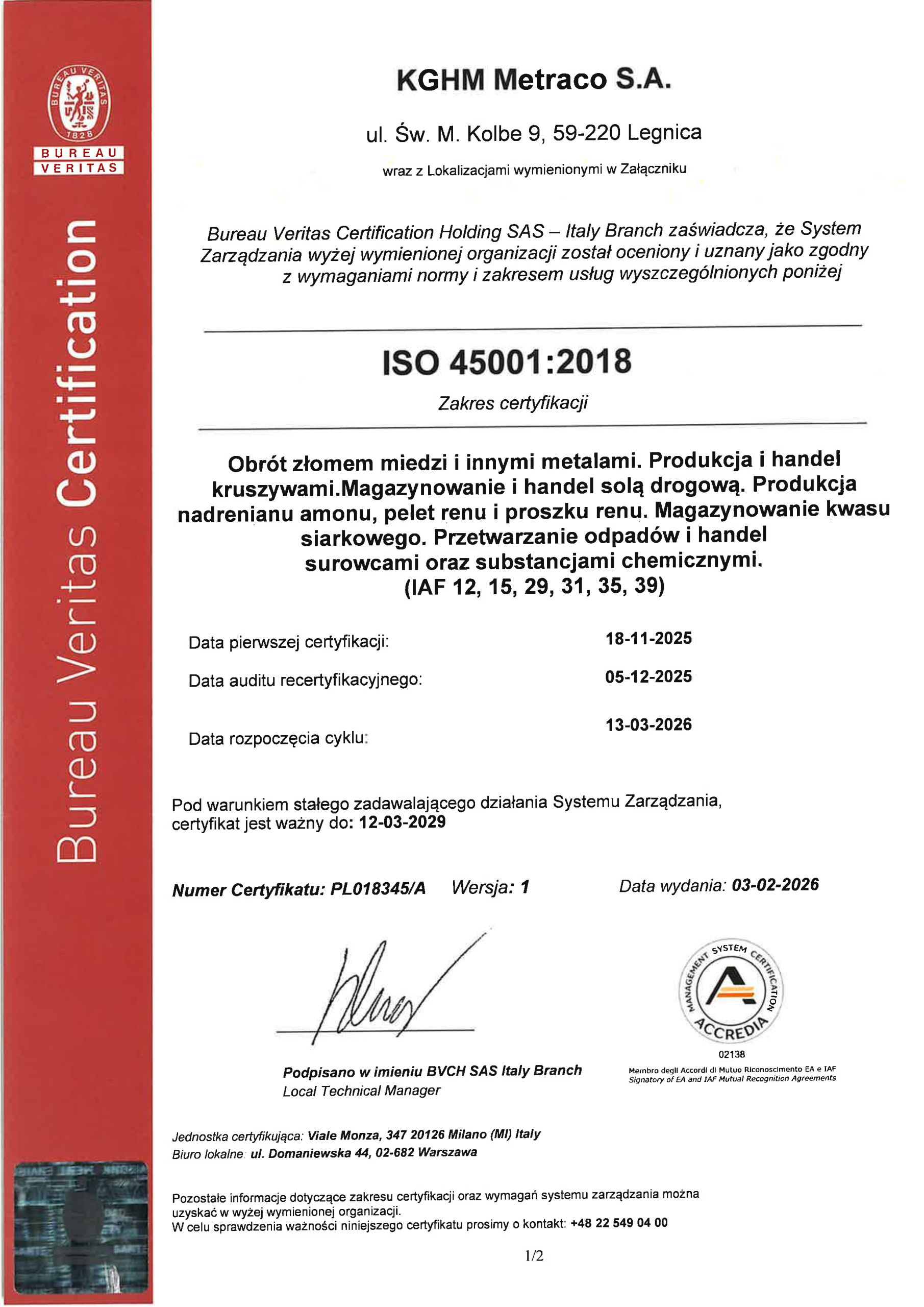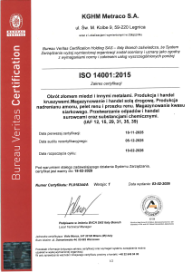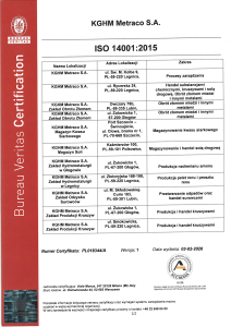 Certyfikaty Zintegrowanego Systemu Zarządzania (PN-EN ISO 9001:2015-10, PN-EN ISO 14001:2015-09 i PN-ISO 45001:2018-06)